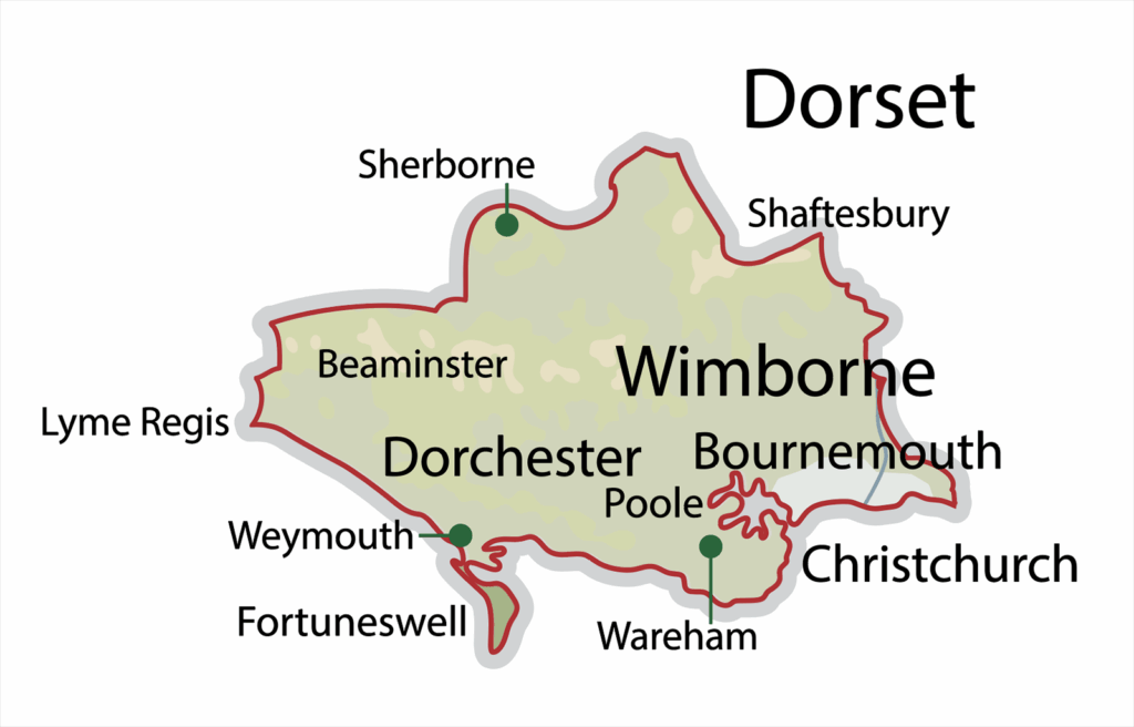 Dorset: Blandford Forum, Bournemouth, Bridport, Christchurch, Dorchester, Lyme Regis, Poole, Shaftesbury, Sherborne, Weymouth, and Wimborne.
