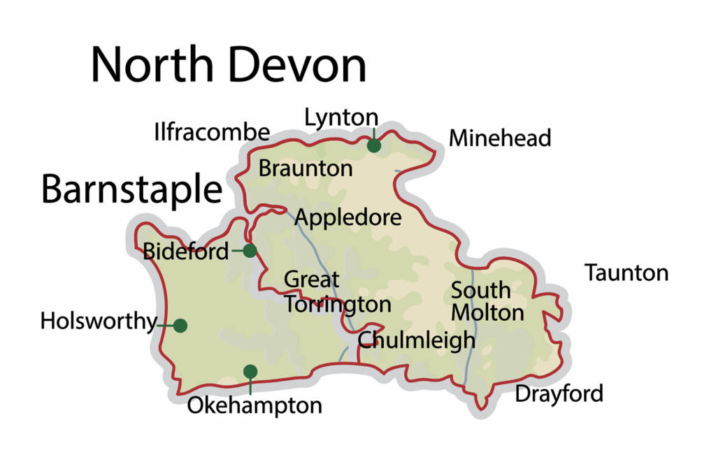 North Devon: Appledore, Bideford, Barnstaple, Braunton, Holsworthy, Ilfracombe, Lynmouth, Minehead, Okehampton, South Molton and Taunton.